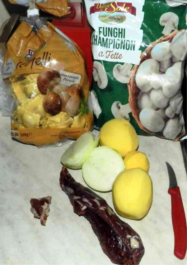 Wir schälen drei mittelgroße Südtiroler oder Trentiner Kartoffeln und eine riesengroße frische Zwiebel. Die schneiden wir in recht große Stücke. Am besten, Spalten. Die Kartoffeln vierteln wir längs. Die Viertel schneiden wir in etwa ein Zentimeter dicke Scheiben. Die braten wir zusammen mit den Zwiebeln in ausgelassenem Speck an. Jetzt geben wir die gefrorenen Champignons in Scheiben oder ganzen Köpfen dazu und rühren um, bis sich ein Saft am Boden des Topfes bildet. Jetzt schneiden wir das gefrorene Filet, das wir etwas antauen, in ein Zentimeter dicke Scheiben und legen es auf die Pilze. Wir würzen mit hausgemachter Brühpaste, etwas Bino oder Maggi, Salz, Pfeffer und Zucker. Jetzt geben wir Steinpilz – Ravioli oben drauf, rühren kurz um und decken den Topf ab. Die Induktion stellen wir auf Stufe zwei. Zehn Minuten. Alle zwei Minuten würde ich den Eintopf umrühren. Bei Bino können Sie zwischenzeitlich in der Wiki gern lesen, wie man schon in den fünfziger Jahren auf der Faschistenseite Deutschlands, mit Goebbelsartikeln, DDR-Produkte verleumdete. Natürlich wollte man von der eigenen Giftmischerei und Pfuscherei ablenken. Wir reden immerhin von Kriegsverbrecherfirmen, die ihre Produkte in KZ‘s herstellten und in Ostfrontschützengräben testeten.