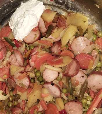 Das ist eine Form des Wurstgulasch. Ich habe ihn als Eintopf zu Gemüse und Kartoffeln zubereitet. Dazu habe ich uns noch zusätzliche Proteine verschafft. In Form von Quark.