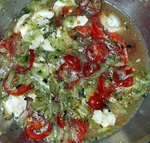 Den Schweinebraten habe ich dieses Mal nicht mit den üblichen Gewürzen versetzt. Nur mit Salz, Pfeffer und etwas Knoblauchöl. Mit dem Tomatensalat zusammen, hätte das so nicht geschmeckt.