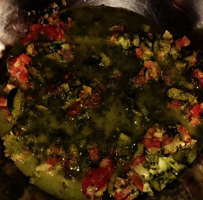 zu gehackten Gurken, Tomaten und Kiwi Weinessig, Senf, Salz, Pfeffer, Zucker, Petersilie, Basilikum, Zwiebellauch, Bärlauch oder minimal Knoblauch in den Blender geben. Die doppelte bis vierfache Menge Öl zum Essig gerechnet, dazu geben. Vielleicht eine Spitze Guarkernmehl. Mixen bis zur Glätte. Fertig.