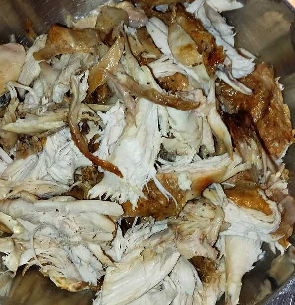 ls Suppe können wir uns das mit einem gekochtem Hähnchen vorstellen. In diesem Fall, habe ich ein Grillhähnchen benutzt. Eigentlich schneidet man das Fleisch nach dem abtrennen von der Karkasse klein. Ich habe darauf verzichtet. Unsere Hähnchengriller vom Kaufhaus sind muslimischem Glaubens. Die essen Hühnchen und Fleisch generell gar bis übergart. Das hat seinen Grund. Es geht um die Vermeidung von Infektionen. Das warm gehaltene Huhn verkaufen die Freunde für den halben Preis. Durch das Erwärmen in Wasser, erhält das Huhn seinen Saft zurück. Das gleicht dem Schmoren.