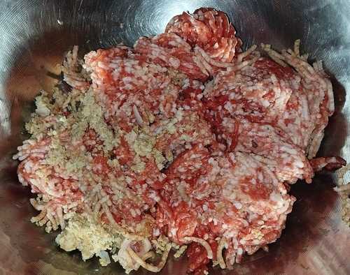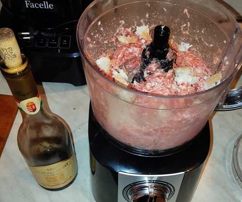 Die Keulen und Flügel stellen wir zusammen wieder kalt. Das abgetrennte Fleisch geben wir in den Fleischwolf – feine Scheibe. Salz, Pfeffer und eventuell etwas Beifuß sind die Gewürze. Dazu zwei bis drei Zwieback. Das zusammen geben wir in den Blixer. Dort fügen wir Marsala oder Tokaj Aszu hinzu und kuttern das bis zu einem bündigen Brät. Das Brät lassen wir einen Tag in einer Form oder mehreren stehen.