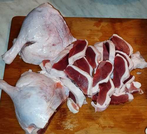 Die lassen wir einen Tag auftauen im Kühlschrank. Die Ente taut nicht komplett auf. Diese Konsistenz benötigen wir für die Teilung und weitere Verarbeitung.