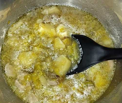 Wir schneiden den Lauch in Ringe und legen ihn in Wasser ein. Die Kartoffeln setzen wir zuerst an in Brühe. Die Brühe bereiten wir uns zur Erntezeit bereits als Trockenbrühe oder Brühpaste vor. Wenn wir das versäumt haben, können wir die Brühe auch aus der Salsicia gewinnen. Dafür benötigen Sie natürlich Sellerie und Karotten. Das hacken wir im Blixer recht klein. Beachten Sie, die Wurst darf nicht kochen. Das dauert entsprechend lange. Die Wurst wird dann entnommen. Erst danach setzen wir die Kartoffeln an. Sobald die Kartoffeln kochen, schäumen wir die Brühe etwas ab und geben nach 5 Minuten den Lauch dazu. Jetzt stellen wir nach dem Aufkochen die Stufe 2 – Induktion ein, decken ab und geben 20 Minuten.