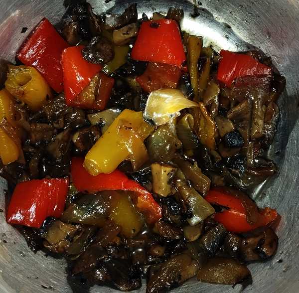 Zwiebel in 16-tel Keile schneiden. Paprika und Champignon in Zwei mal Zwei Zentimeter große Stücke schneiden oder vierteln. Das, in nicht zu wenig Öl, anbraten. Salz, Pfeffer, Zucker zugeben und den Saft einreduzieren. Mit Essig Ihrer Wahl ablöschen und wieder einreduzieren. Das dauert auf Stufe 6 – Induktion etwa zehn Minuten. Abkühlen. Fertig.