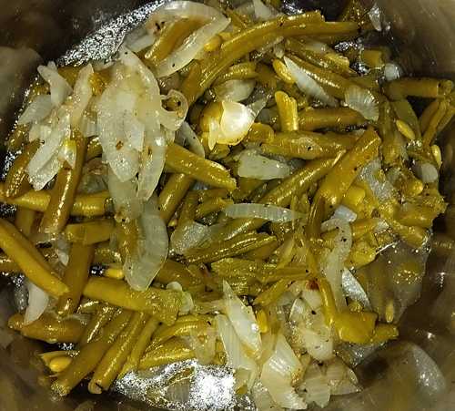 Gefrorene Bohnen mischen wir unter und lassen die zugedeckt, zumindest die 100°C erreichen. Danach stellen wir die Flamme ab. Wer die Bohnen etwas garer wünscht, gibt 5-10 Minuten zugedeckt. Danach abkühlen lassen.