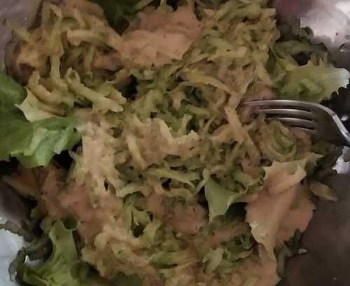 Frisch geernteter Salat vom Balkongarten mit einem Dressing von Gurken, Tomate, Meerrettich, Senf, Weinessig, Nussöl und Guarkernmehl. Etwas Salz, Pfeffer und Zucker müssen Sie dazu geben. Ich habe das mit Petersilie und Schnittlauch angereichert. Fertig.