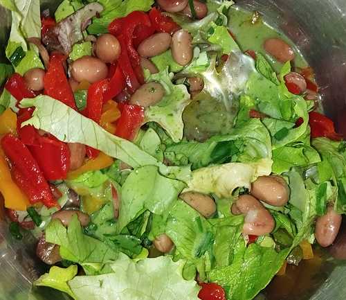 Zu Dressing von Knoblauchrauke. Den Salat bis 10 Minuten in lauwarmes Wasser einlegen. Dabei wird er knackig. Klein geschnittene Peperoni und Bohnen aus der Dose ohne Saft dazu geben. Das Dressing stellen wir aus der Marinade des eingelegten Paprika, des flüssigen Pesto von Knoblauchrauke, etwas Zucker und Pfeffer und einer Messerspitze Guarkernmehl her. Wir können etwas Pfeffer zusetzen. Den Mixstab so lange rein halten, bis das Dressing bündig wird.
