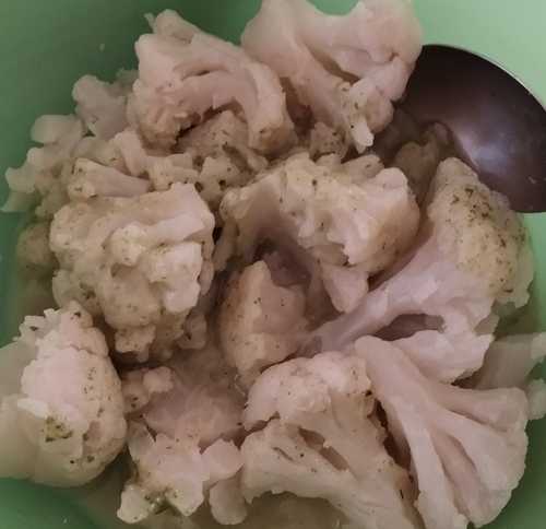 Der Blumenkohl ist 15 Minuten weich zu kochen zugedeckt auf Stufe 2 der Induktion. Den Blumenkohl würzt man nur mit Salz. Nach dem Kochen den Deckel öffnen, das restliche Kochwasser abgießen oder für eine Suppe sammeln. Den Blumenkohl abkühlen lassen und mit dem Knoblauchraukedressing übergießen.