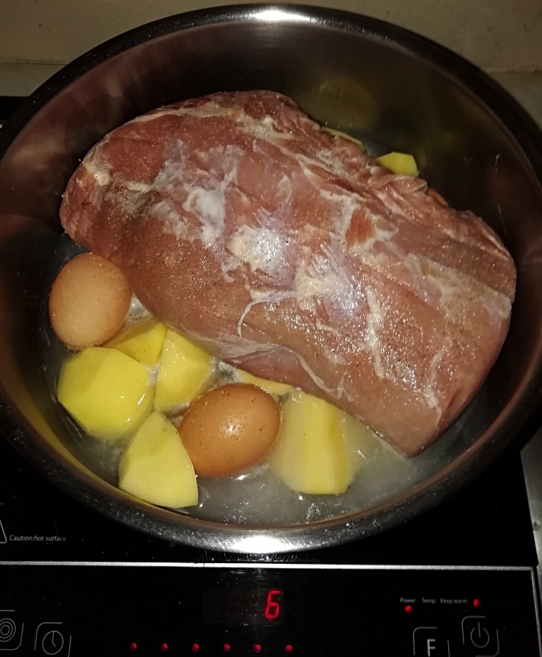 Als Hauptbeilage servieren wir einen Schweinsrücken, den wir im Grill schon am Tag vorher, zwanzig Minuten pro Kilo, gut gewürzt, gegrillt haben.