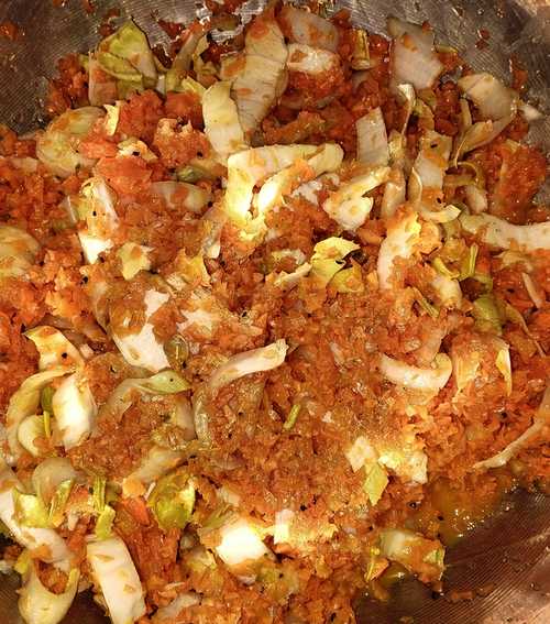 Das Ergebnis geben wir in eine Schüssel. Jetzt kommt Öl drauf. Umrühren. Fertig.